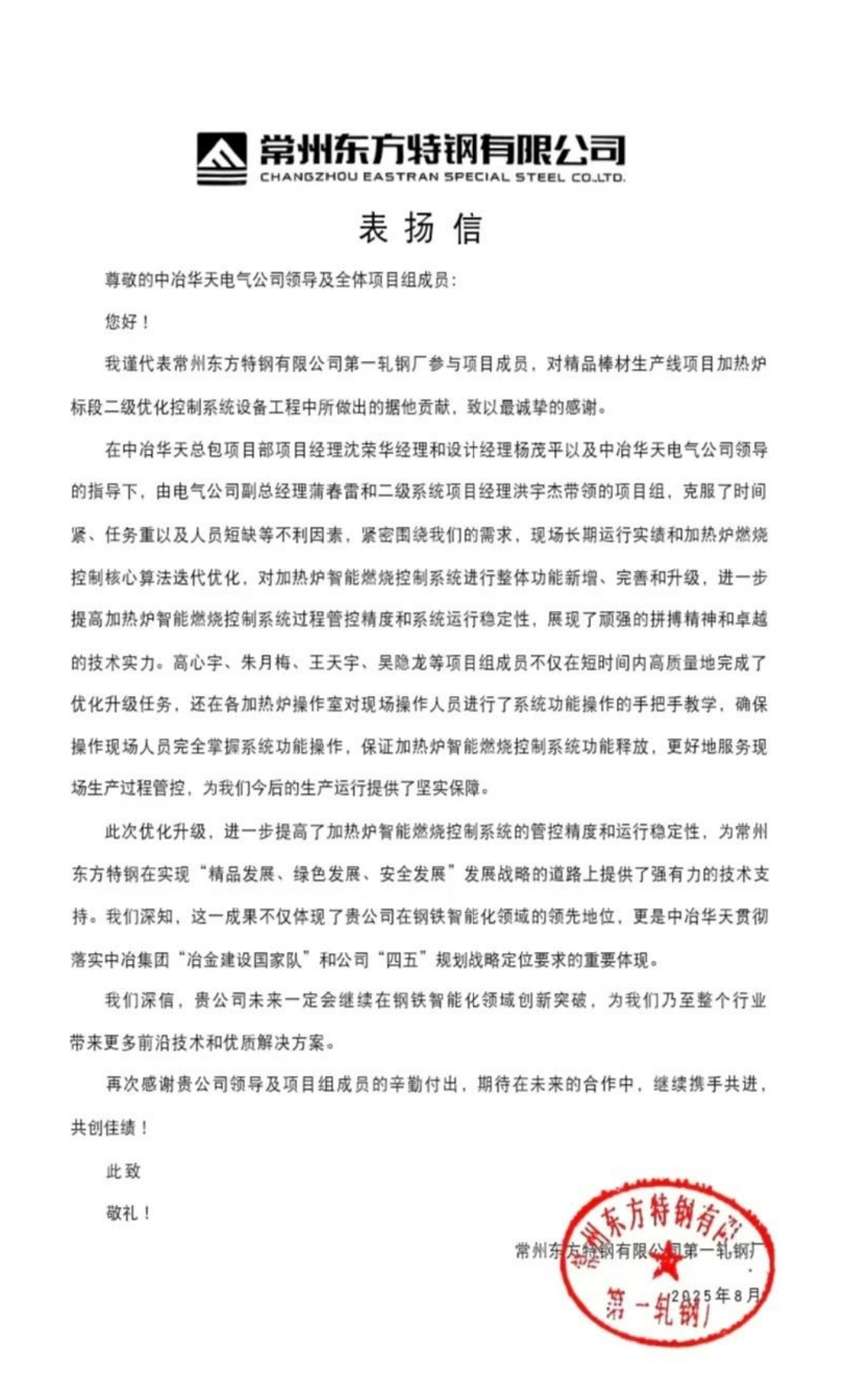 Recently, the Level 2 Optimization Control System project for the heating furnace section of the Dongfang Special Steel Co., Ltd. 800,000-ton high-quality bar production line project, undertaken by MCC Huatian Electric Corporation, received a letter of commendation from the owner. This represents further recognition from the owner following its official handover on November 30, 2024, demonstrating MCC Huatian's technical strength in the field of steel intelligentization.