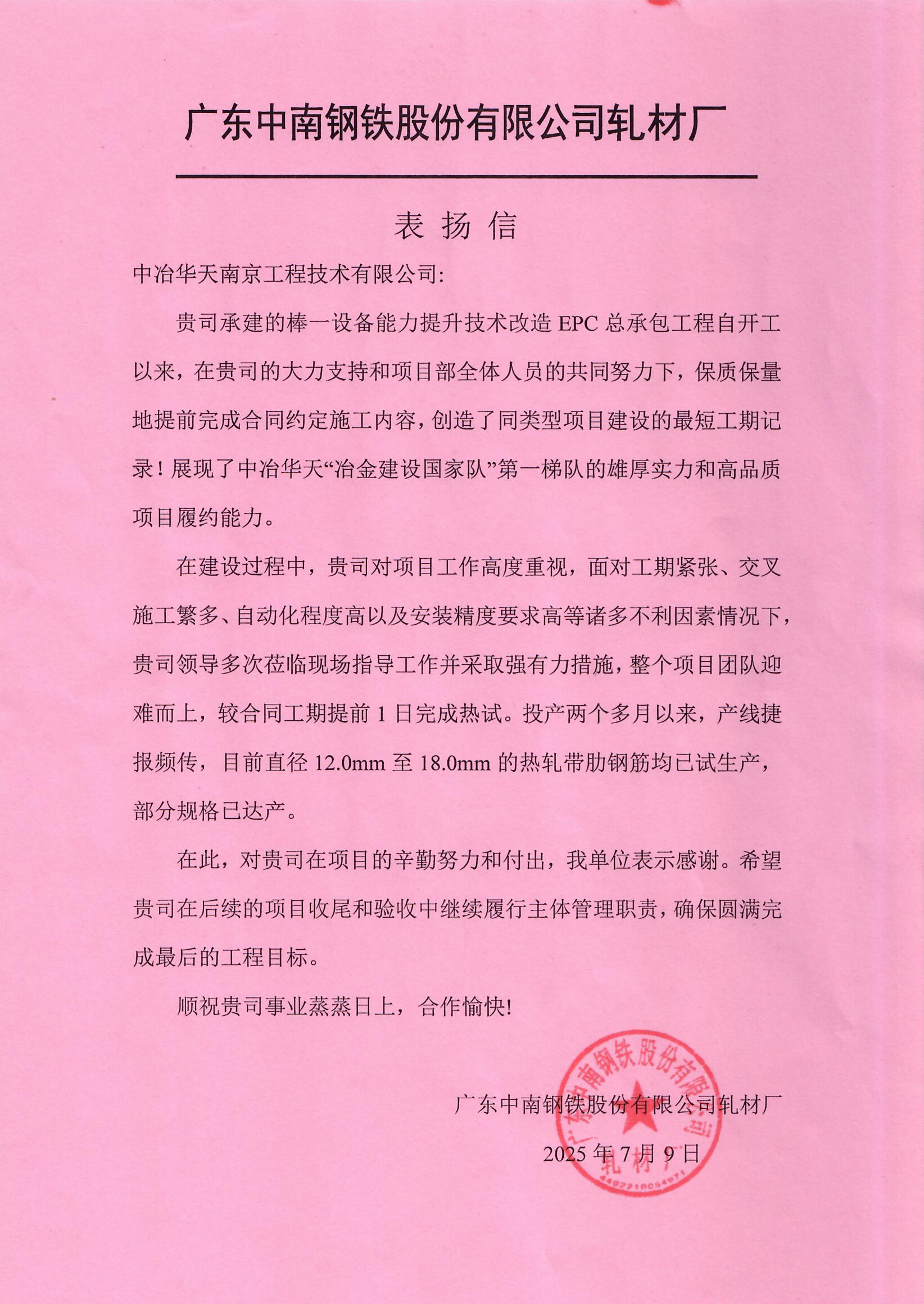 感謝信中,中南股份軋材廠對(duì)中冶華天承建的棒一設(shè)備能力提升技術(shù)改造EPC總承包工程的高效推進(jìn)與卓越成果給予了高度肯定,并對(duì)中冶華天團(tuán)隊(duì)展現(xiàn)出的專業(yè)素養(yǎng)與敬業(yè)精神表示由衷的感謝與欽佩。與此同時(shí),也對(duì)后續(xù)收尾驗(yàn)收階段項(xiàng)目團(tuán)隊(duì)持續(xù)發(fā)揮主體管理作用、確保工程圓滿收官寄予了殷切期望。