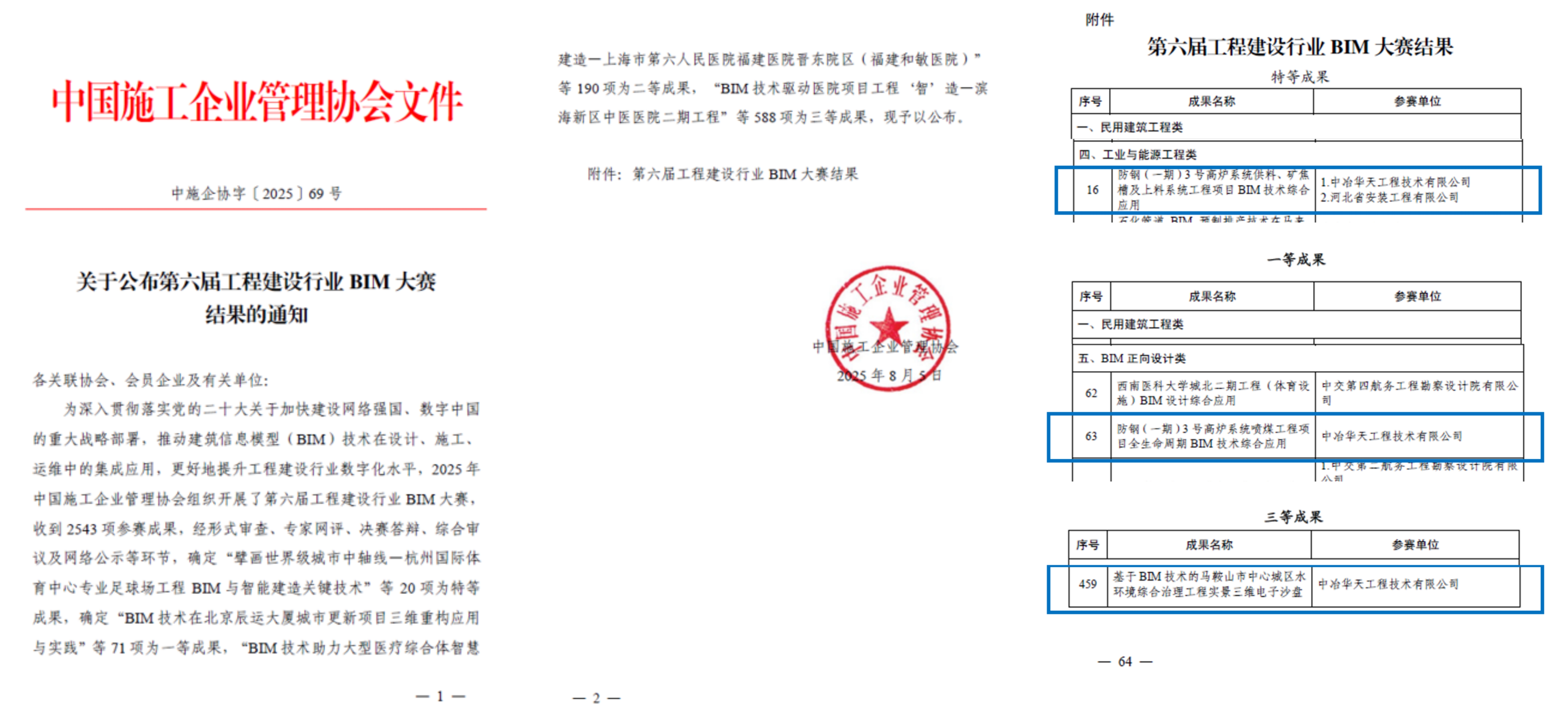 近日,中國施工企業(yè)管理協(xié)會宣布第六屆全國工程建設(shè)行業(yè)BIM大賽結(jié)果,中冶華天參賽作品“防鋼(一期)3號高爐系統(tǒng)供料、礦焦槽及上料系統(tǒng)工程項目”和“防鋼(一期)3號高爐系統(tǒng)噴煤工程”分別榮獲工業(yè)與能源工程類“特等獎”和BIM正向設(shè)計類“一等獎”,參賽作品“基于BIM技術(shù)的馬鞍山市中心城區(qū)水環(huán)境綜合治理工程實景三維電子沙盤”獲得市政公用工程類“三等獎”。獲得以上榮譽,實現(xiàn)歷史性突破,不僅是對中冶華天項目建設(shè)成果的高度認可,也集中展示了其工程數(shù)字建造創(chuàng)新能力,再次擦亮“中冶華天,綠色明天”品牌。
